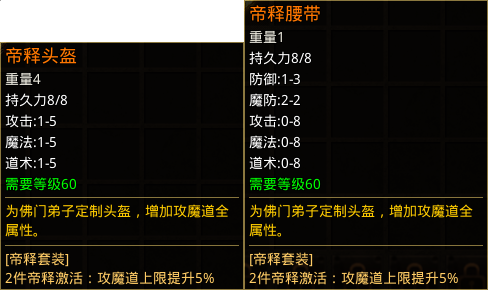 1、帝释套 帝释头盔:攻击1-5,魔法1-5,道术1-5 帝释腰带:防御1-3,魔防2-2,攻击0-8,魔法0-8,道术0-8