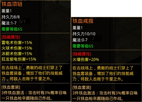 2、铁血套 铁血头盔:攻击24-0,魔法24-0,道术24-0 铁血项链:魔法1-7,雷电术伤害+15%,火球术伤害+15%,冰箭术伤害+15%,狂龙紫电伤害+15% 铁血手镯:魔法0-5,冰咆哮伤害+10% 铁血戒指:魔法0-7,火墙伤害+20% 铁血靴子:防御18-18,魔防18-18