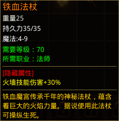 2、铁血法杖:魔法4-9,火墙技能伤害+30% 目前应该是最能提升火墙伤害的武器了,但是比起上面的也贵一些